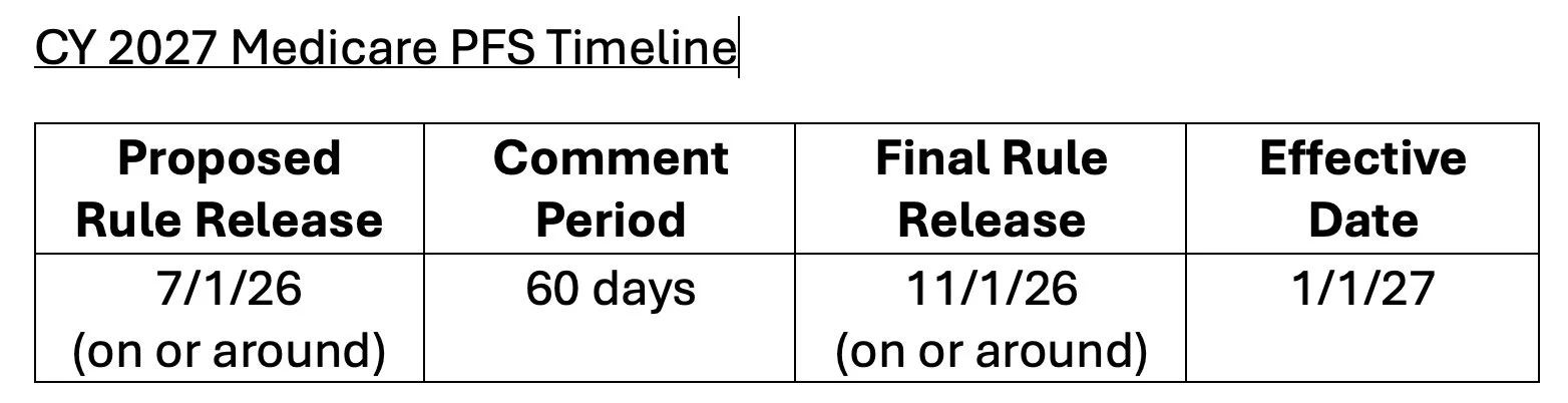 The table below describes the anticipated timeline for the CY 2027 Medicare PFS.
