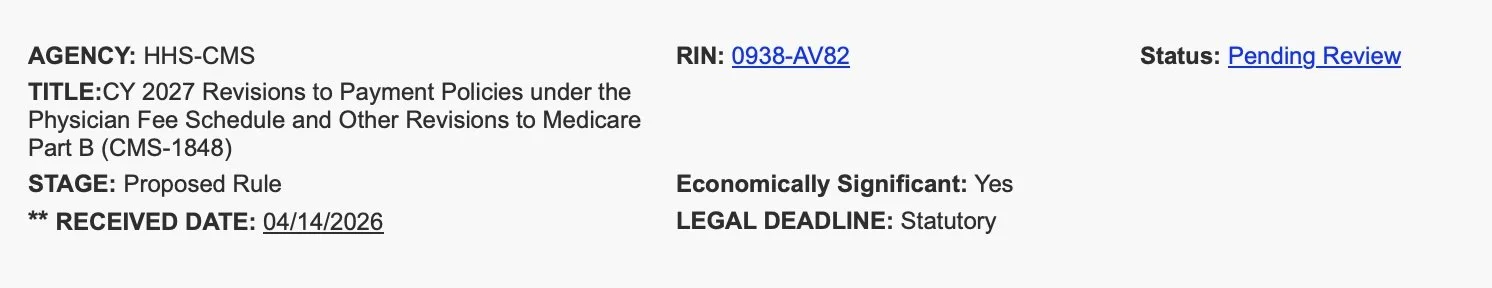 As anticipated from yesterday’s update on the CY 2027 Hospital Outpatient Prospective Payment System (OPPS) Proposed Rule, the CY 2027 Medicare Physician Fee Schedule (PFS) has arrived at the Office of Management and Budget (OMB). This is the last review step before it is publicly released. It is typical for the rule to be posted this early, and we anticipate it will be released on or around July 1.